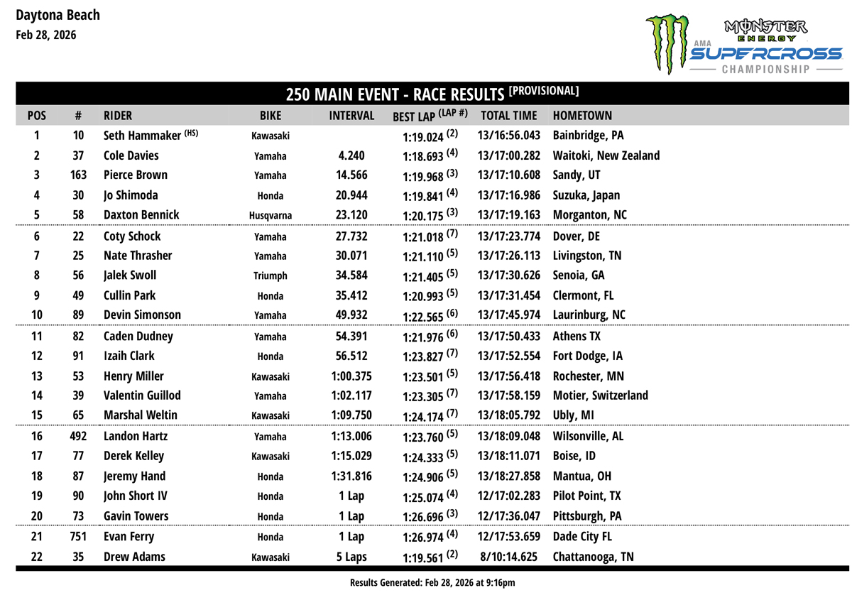 The second race of the Eastern Divisional 250SMX Class Championship at the 2026 Daytona Supercross featured an impressive showing from Monster Energy Pro Circuit Kawasaki’s Seth Hammaker, who entered the night show banged up from a hard crash in afternoon qualifying.