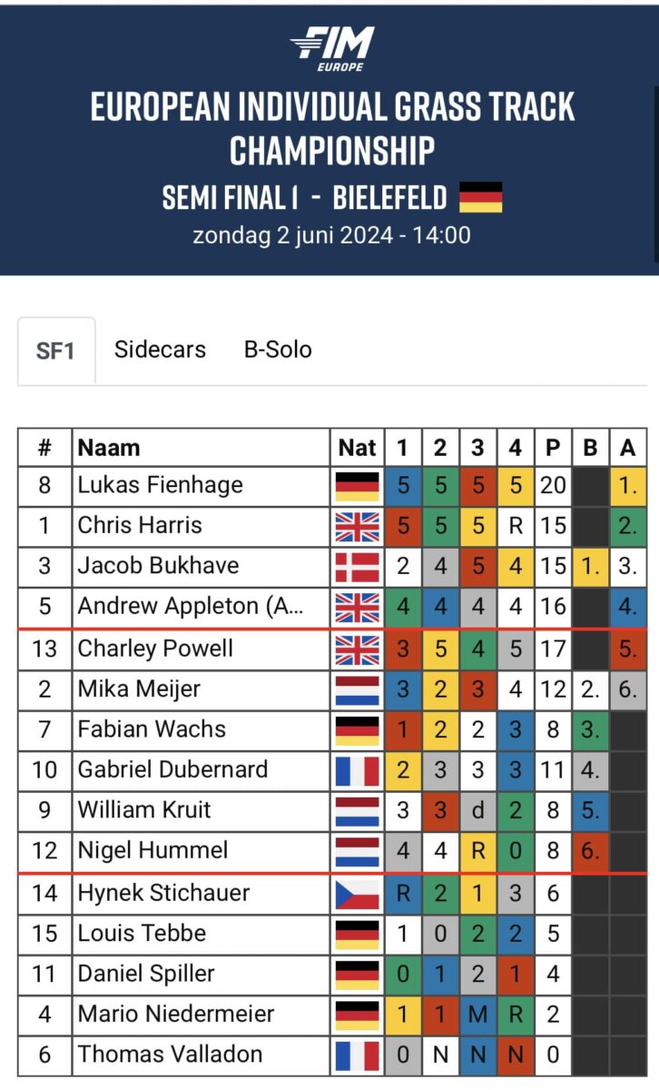 Semi-Final 1 of the European Individual Grass Track Championship was held on Sunday in Bielefeld, Germany, under challenging conditions.