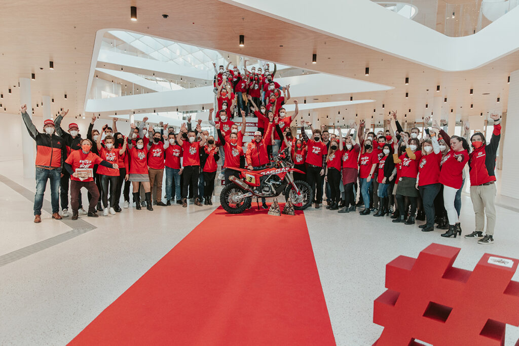 To celebrate the 2022 Dakar victory in style, Sam Sunderland handed out the trophy at the Headquarters to Mr. Pierer (CEO PIERER Mobility AG), before riding his winning Dakar bike through various buildings for the stoke of all employees.