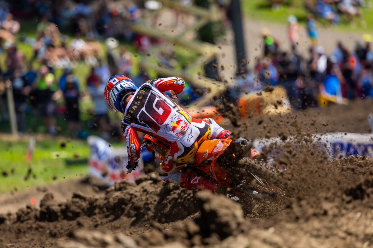 With half the moto to go, Jett Lawrence’s lead sat at 11 seconds over Tomac, with Hunter Lawrence a few more seconds behind in third. As Jett Lawrence sustained his lead, Hunter Lawrence briefly closed in Tomac but then settled into third. However, Tomac stalled his motorcycle late in the moto, which allowed Hunter Lawrence to take over second as Tomac resumed in third.