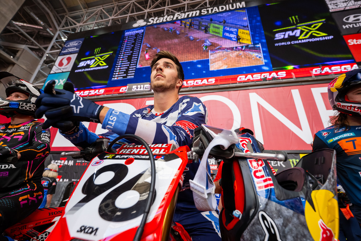 In front of a record-breaking crowd in Glendale, Arizona, for round 5 of AMA Supercross, the premier-class main event delivered high drama in the championship fight. Hunter Lawrence powered to a strong second-place finish—his fourth runner-up result in a row—and, for the first time in his 450SX career, took possession of the red plate that goes to the championship leader.