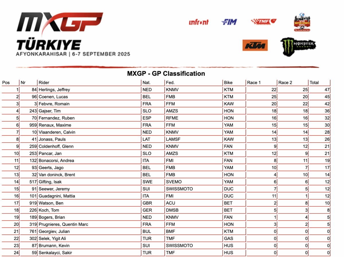 Jeffrey Herlings has won his 111th GP victory after taking the win at the 2025 MXGP of Turkiye in Afyonkarahisar today, with Lucas Coenen second and Romain Febvre third.