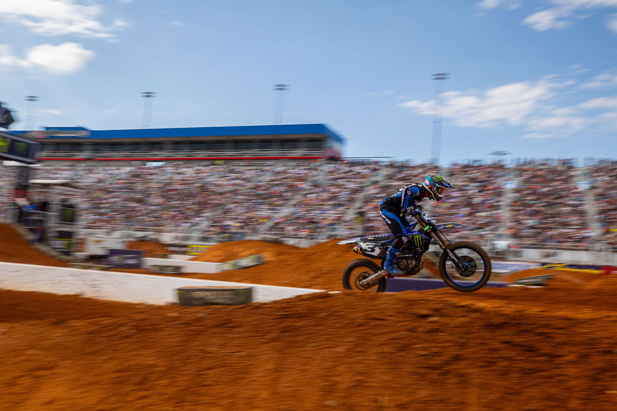 Monster Energy Yamaha Star Racing’s Eli Tomac dominated the first 450SMX moto on the high-speed, hybrid SuperMotocross track. He led most of the second moto but finished in the runner-up spot after a fierce battle with Lawrence. SuperMotocross event results are determined by a combined two-moto score, so Tomac earned second overall with (1-2) moto finishes.