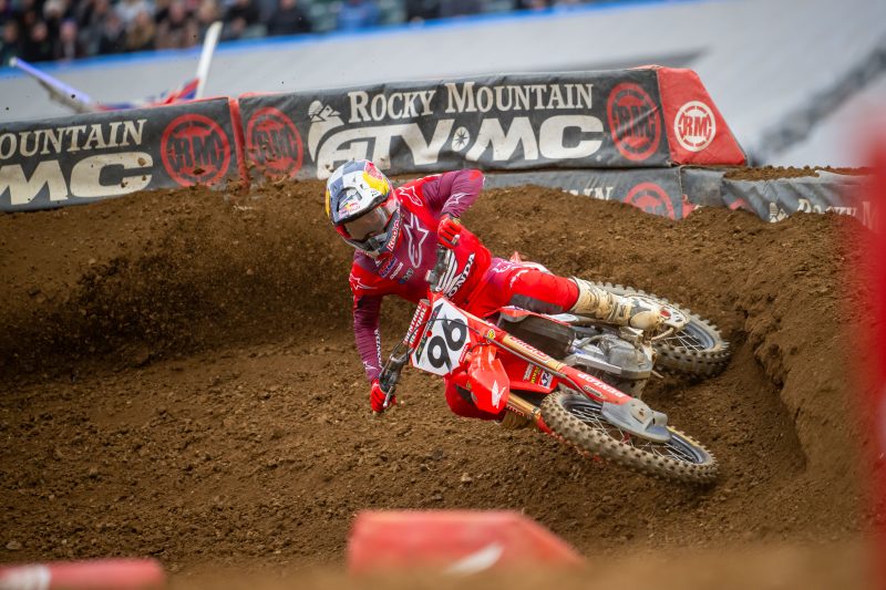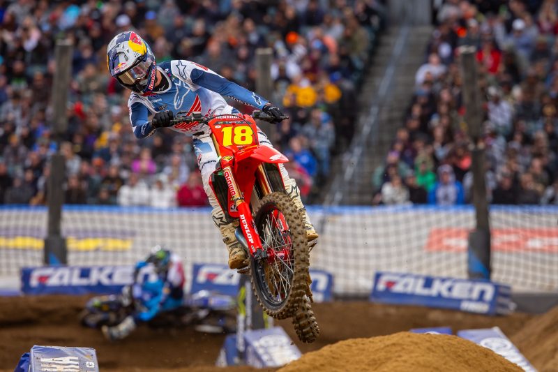 Starting the 450SX main event just outside the starter’s box, Jett pulled a high-pressure holeshot and simply never looked back, ultimately winning by over five seconds. Title-rival Cooper Webb sat second for most of the race but was passed late by Chase Sexton and Jason Anderson. Meanwhile, Hunter rode almost the entire race in seventh place. He put a pass on Justin Barcia for sixth with just over a lap remaining, but Barcia got back by shortly after.