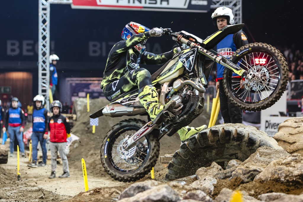 Triumph Factory Racing Enduro Team’s Jonny Walker stormed to second overall at round three of the 2026 FIM SuperEnduro World Championship in Bilbao, Spain. Tackling one of the season’s tightest and most technical tracks aboard his TF 450-E, Walker claimed his third consecutive runner-up finish and continues to hold second place in the championship standings.