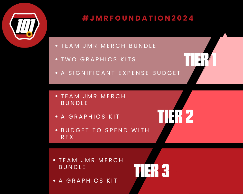 ● Tier 1: The highest tier includes a Team JMR merch bundle, two graphics kits, and a significant expense budget that riders can spend where they choose.