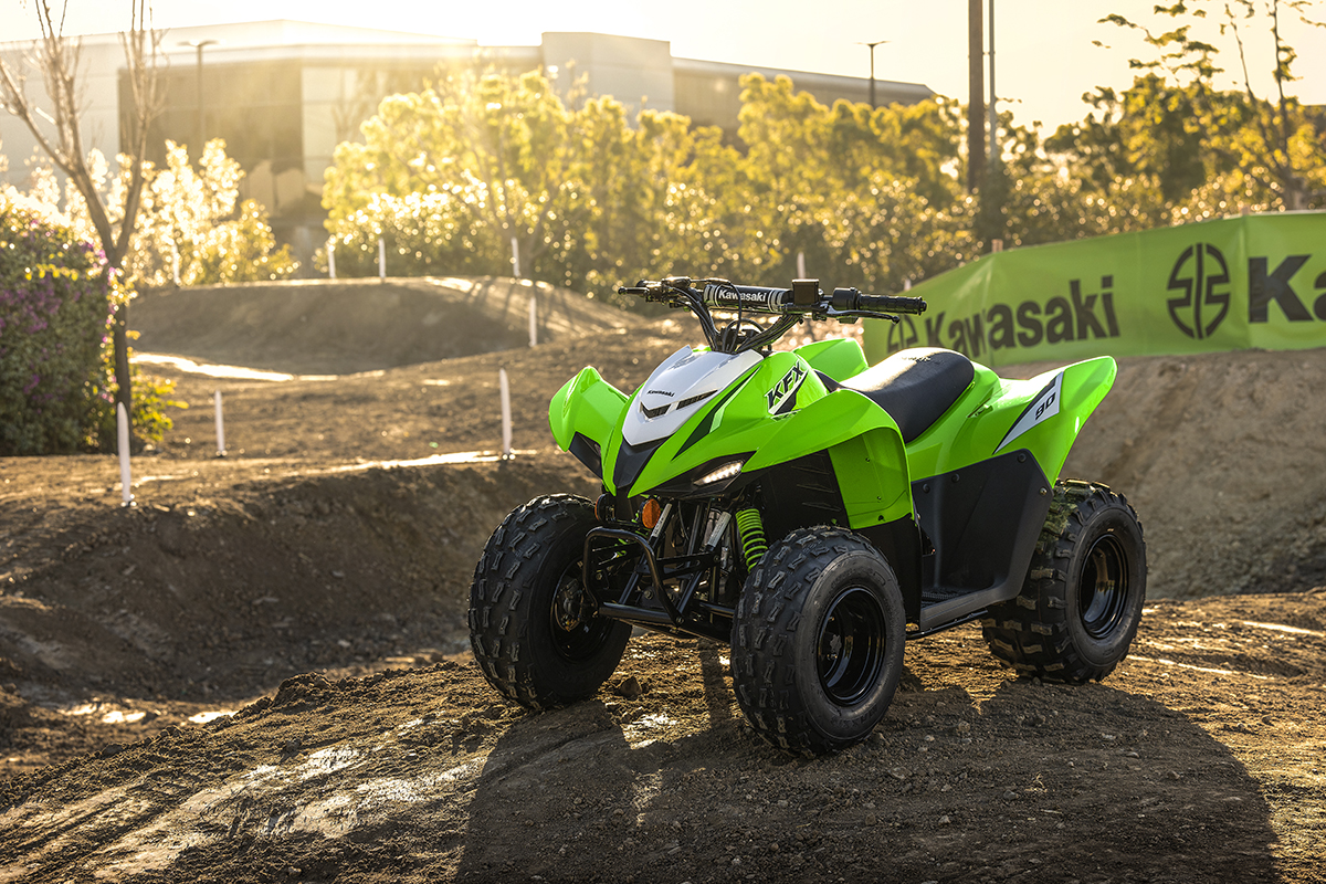 Aggressively styled to echo larger, adult focused KFX quad machines – as well as drawing influence from the two-wheeled KX motocross range – there is no mistaking the updated and restyled frontal area of the lime green racing bodywork with its tall front fenders and Kawasaki branded handlebar pad, but that is just part of the story.