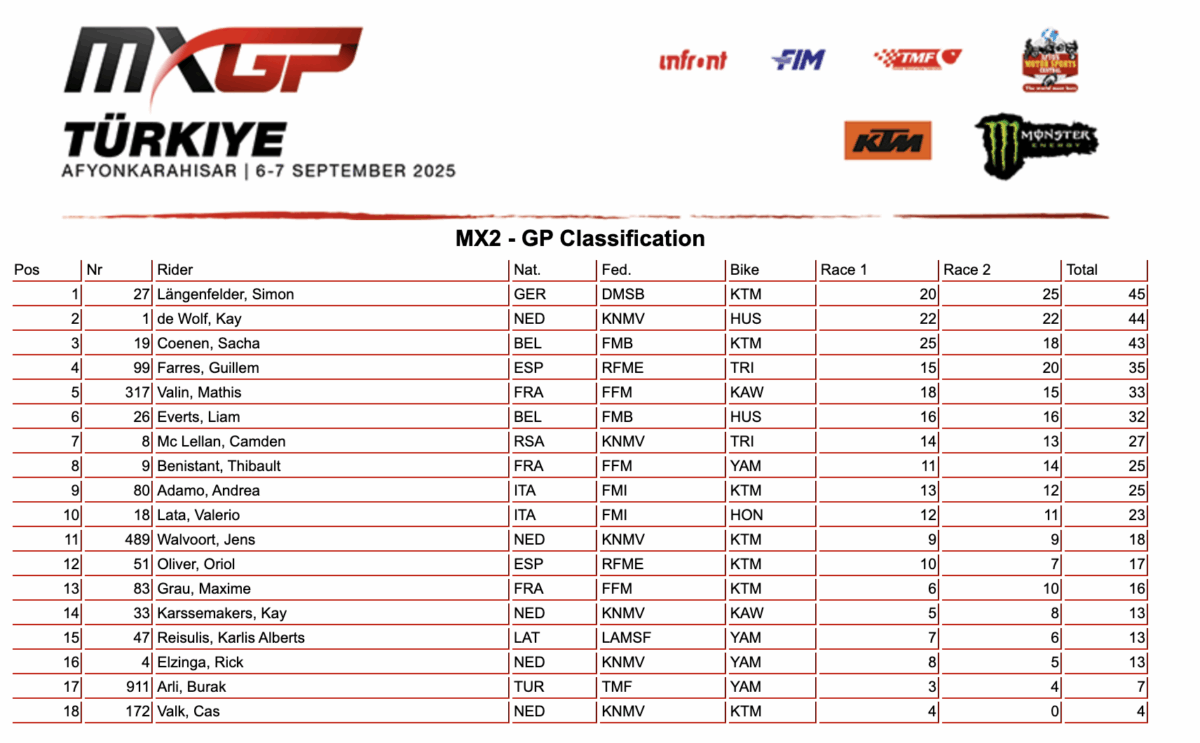 Simon Laengenfelder has kept hold of his MX2 FIM World Motocross Championship lead after winning the second moto of the MXGP of Turkiye, holding off the hard-charging Kay de Wolf. De Wolf would finish second overall, too, with race one winner Sacha Coenen in third.