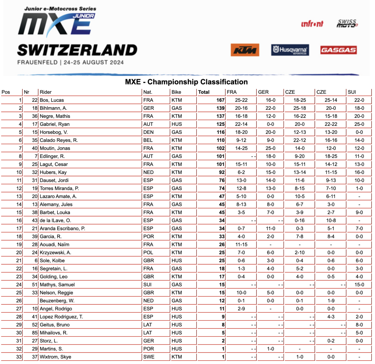 Junior e-Motocross Manufacturers – Classification: 1. KTM, 187 points; 2. GASGAS, 170 p.; 3. Husqvarna, 132 p