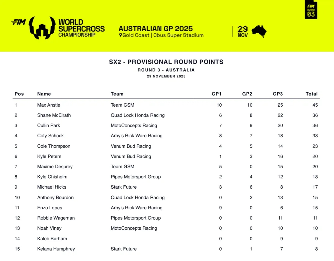 Max Anstie won all three races in another commanding display to increase his lead in the 2025 World Supercross Championship SX2 class.