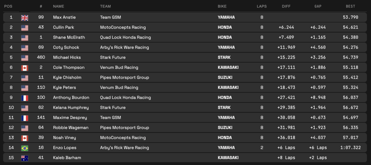 Cullin Park was third for MotoConcepts Racing after going 4-2-3 on the night.