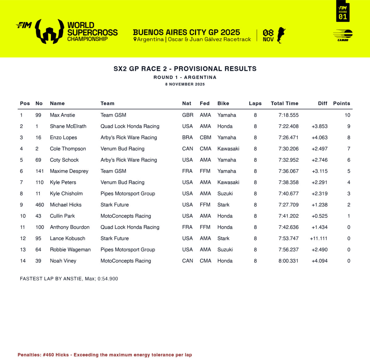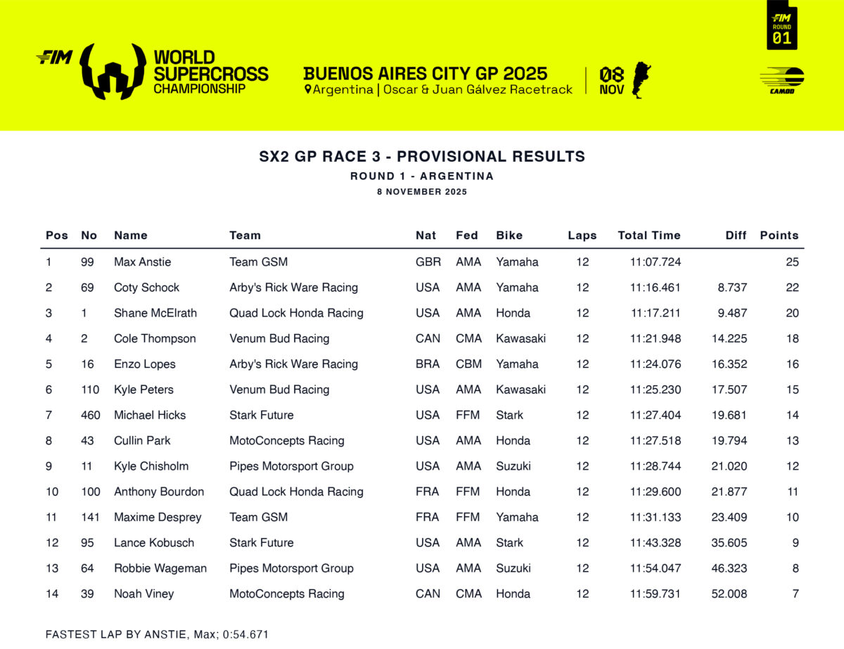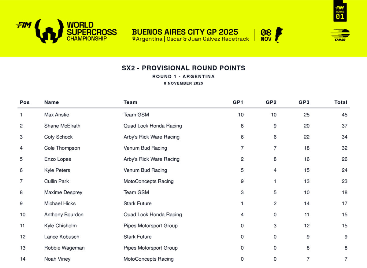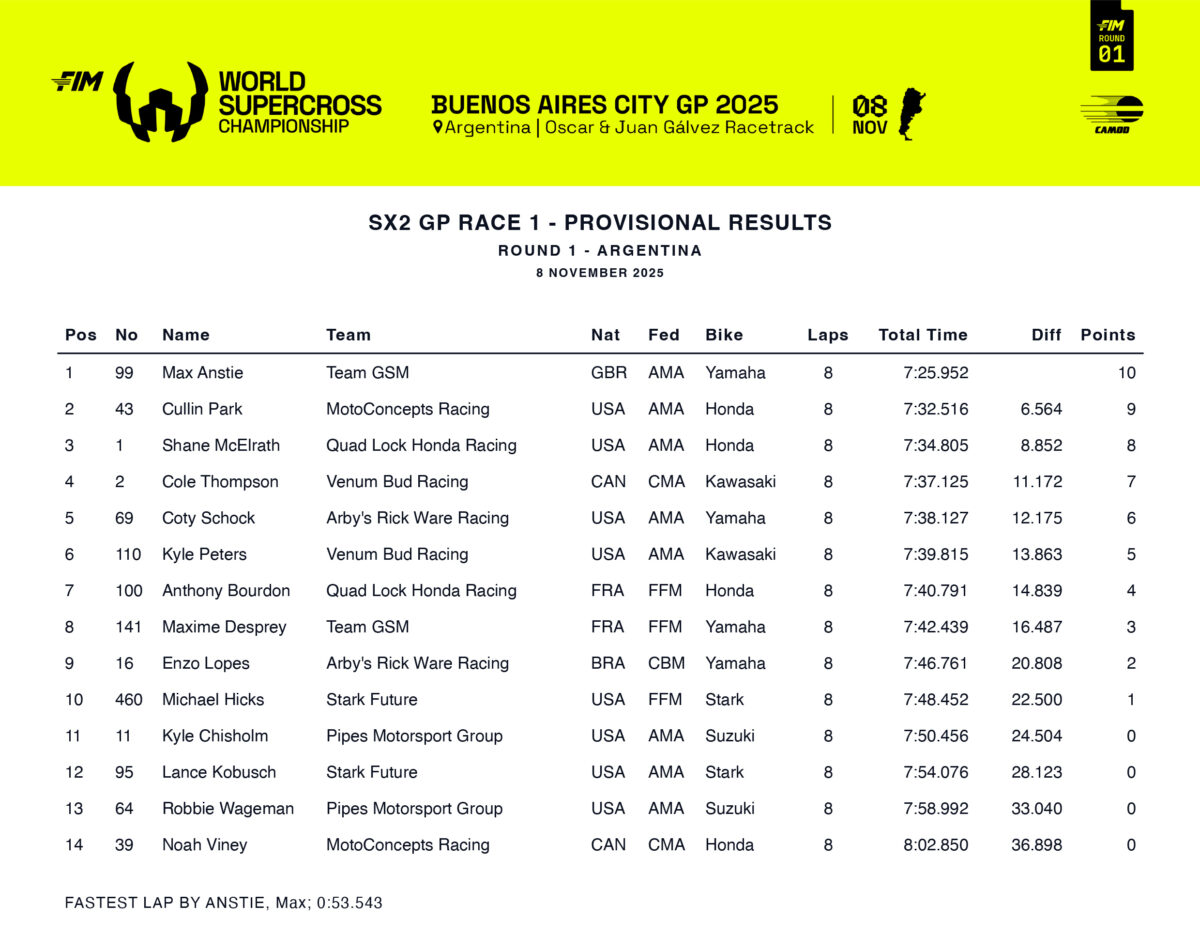 The British racer Max Anstie delivered an SX2 clean sweep, taking the Superpole and winning all three races at the Buenos Aires City GP, which was round 1 of the 2025 FIM World Supercross Championship.