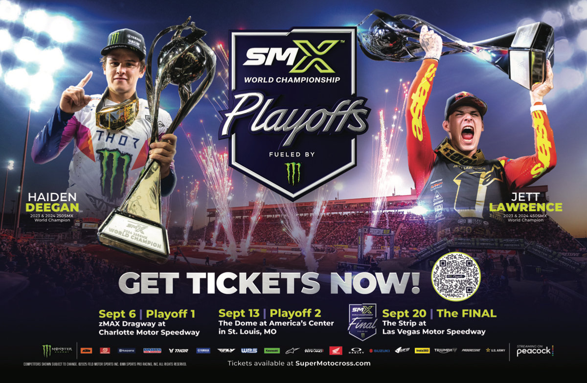 The highly anticipated post-season kicks off on Saturday, September 6 with Playoff 1 at zMAX Dragway in Concord, North Carolina. It continues with Playoff 2 at The Dome at America’s Center in St. Louis, Missouri, and culminates with the World Championship Final on Saturday, September 20 at The Strip at Las Vegas Motor Speedway in Las Vegas, Nevada as defending champions Jett Lawrence and Haiden Deegan look to reclaim their crowns as the world’s best.