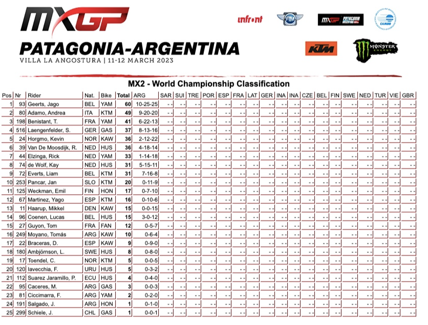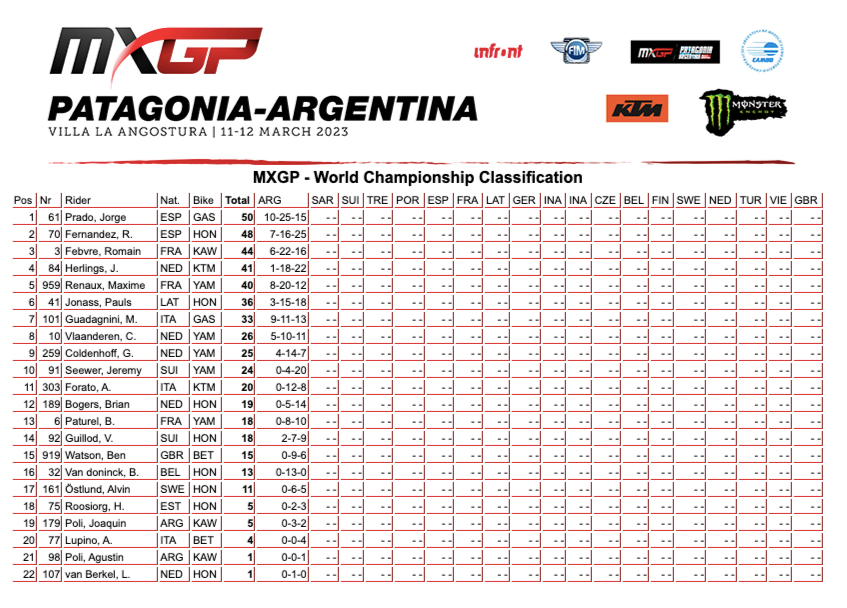 Take a view of the full set of results from today’s MXGP of Patagonia-Argentina and round 1 of the 2023 FIM World Motocross Championship.