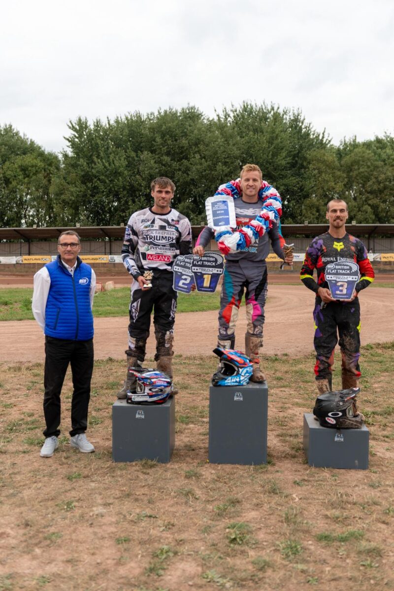 The stacked Pro Class Final saw all of the main championship contenders in good qualifying positions at the conclusion of the heats. Both Tim Neave and Jack Bell, who were holding the top 2 championship positions going into the final, were on the front row where they were joined by former World Cup number 2 and ex-speedway rider Tom Woolley, together with young rising star Thomas Hunt. The other title contender, Royal Enfield’s Gary Birtwistle, was on the 2nd row with some work to do. As the green light went out, it was Tom Woolley who got the holeshot and led the pack away, showing good speed following his return to Flattrack racing this year. The first few laps were intense with close racing as riders jockeyed for position. As the race developed, it was Tim Neave who quickly made his way to the front, and Gary Birtwistle also made some great moves to work his way through to second. Jack Bell was always challenging and battling at the front and worked his way to through to 3rd. Tim continued to turn fast laps and with his super smooth riding style pulled out a small gap on the chasing pack to take the win and with it claim the British Pro Class title, behind him as the race reached it’s conclusion it was Gary Birtwistle in 2nd, Jack in 3rd and Thomas Hunt who’d worked his way up to 4th.