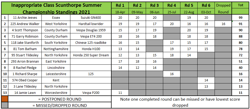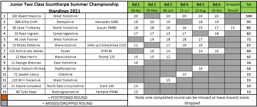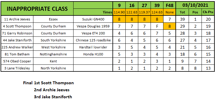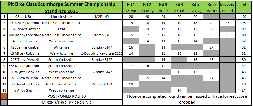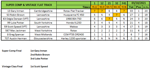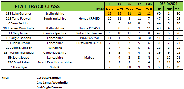 Luke Gardner went unbeaten in the Flat Track class but it wasn’t enough to take the title away from Jack Bell who would win the championship even though he was absent using this round as his dropped one. Gardner would finish four points off of Bell at the end of the series with Terry Pywell third after finishing second in the finale.