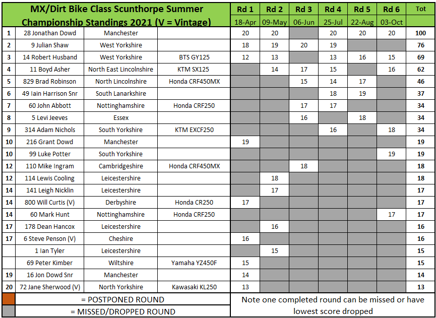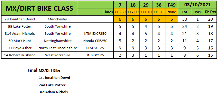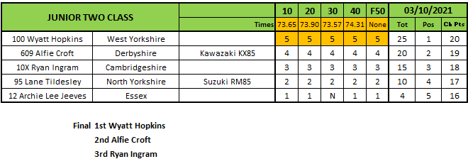 In the MX class Jonathan Dowd continued his dominance, taking maximum points, the final and the title. Luke Potter was second in the final with Adam Nichols third.