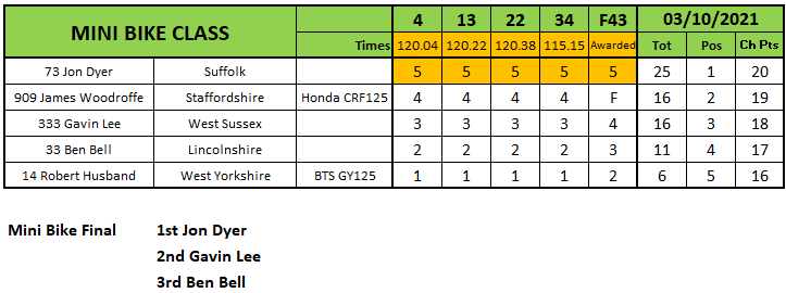 Jon Dyer in the Minibikes rattled off five heat wins and notched another in the final over eventual champion Gavin Lee and Ben Bell. The title though would go the way of James Woodruffe who had a fantastic season.