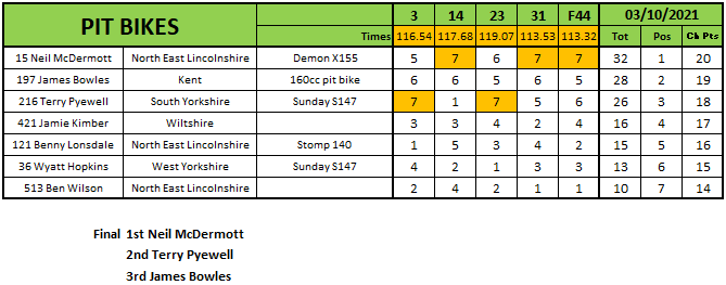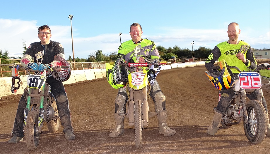 In the Pitbike category, Neil Mcdermott and Terry Pywell shared the chequers with McDermott number one in the final over Pyewell and James Bowles. Jack Bell though would claim the title adding that to his Flat Track crown.