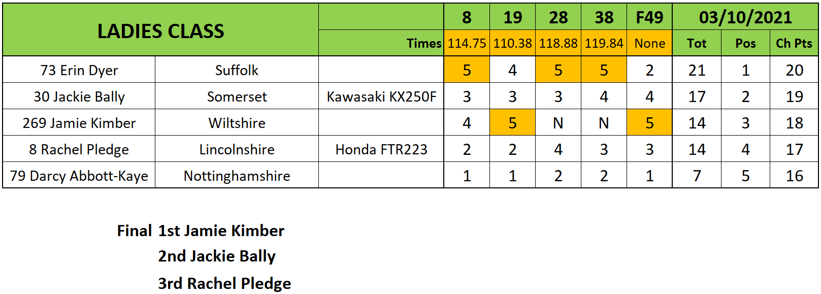 A couple of non starts for Jaime Kimber hampered her progress in the Ladies class but she came good when it mattered in the final to win out over triple heat winner Erin Dyer and Rachel Pledge who would be crowned the champion by just one point over Jackie Bally.