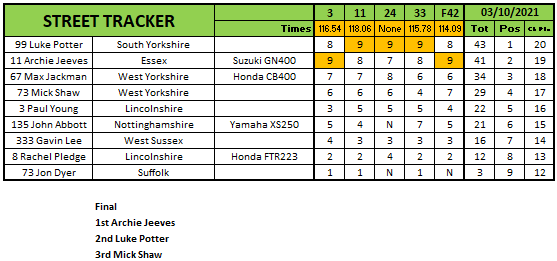 In the Street Trackers Luke Potter and Archie Jeeves went at it to take the Final round spoils with Jeeves ending the day with the victory in the final over Potter and Mick Shaw. The Championship title though would go the way of Max Jackman who won 4 out of the 5 rounds he raced in.