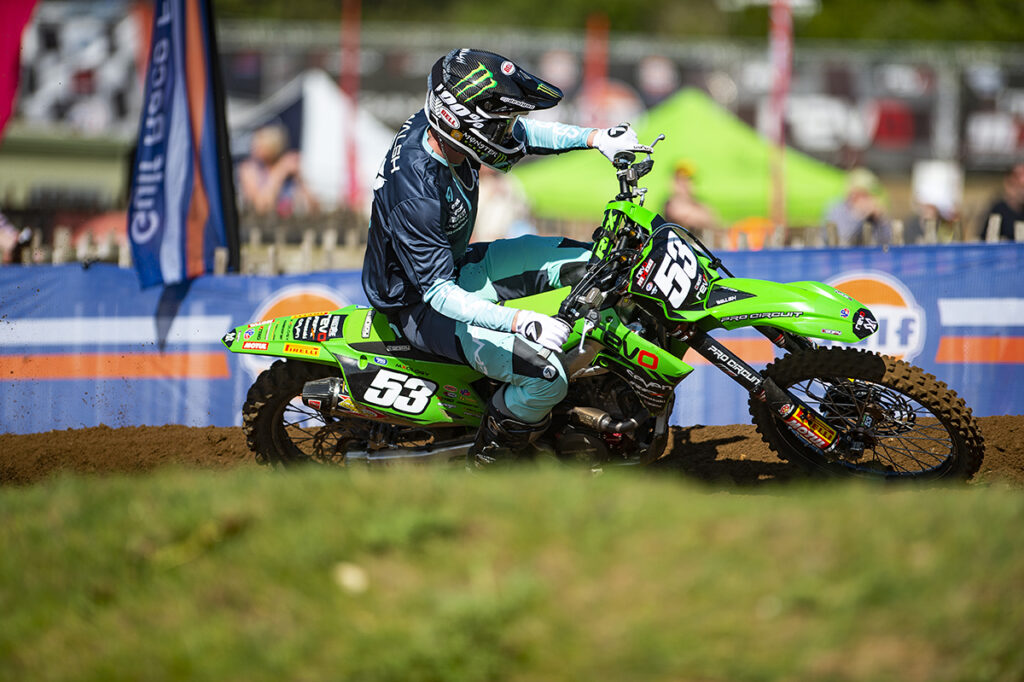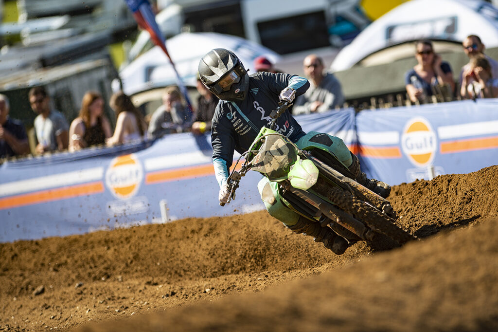 In the class of which he was champion in 2019, Dylan qualified strongly in 2nd despite running with a hastily-modified machine due to the short-notice change of bike. The engine had many stock components but Dylan blasted into 2nd from the start of race one, and held it til the flag. That was followed by Dylan taking the holeshot in race two, and holding off series leader Conrad Mewse for several laps, despite fuel pressure issues restricting the power of the KX250 with his suspension flown across from the USA. Dylan was very happy to be on the podium once more.