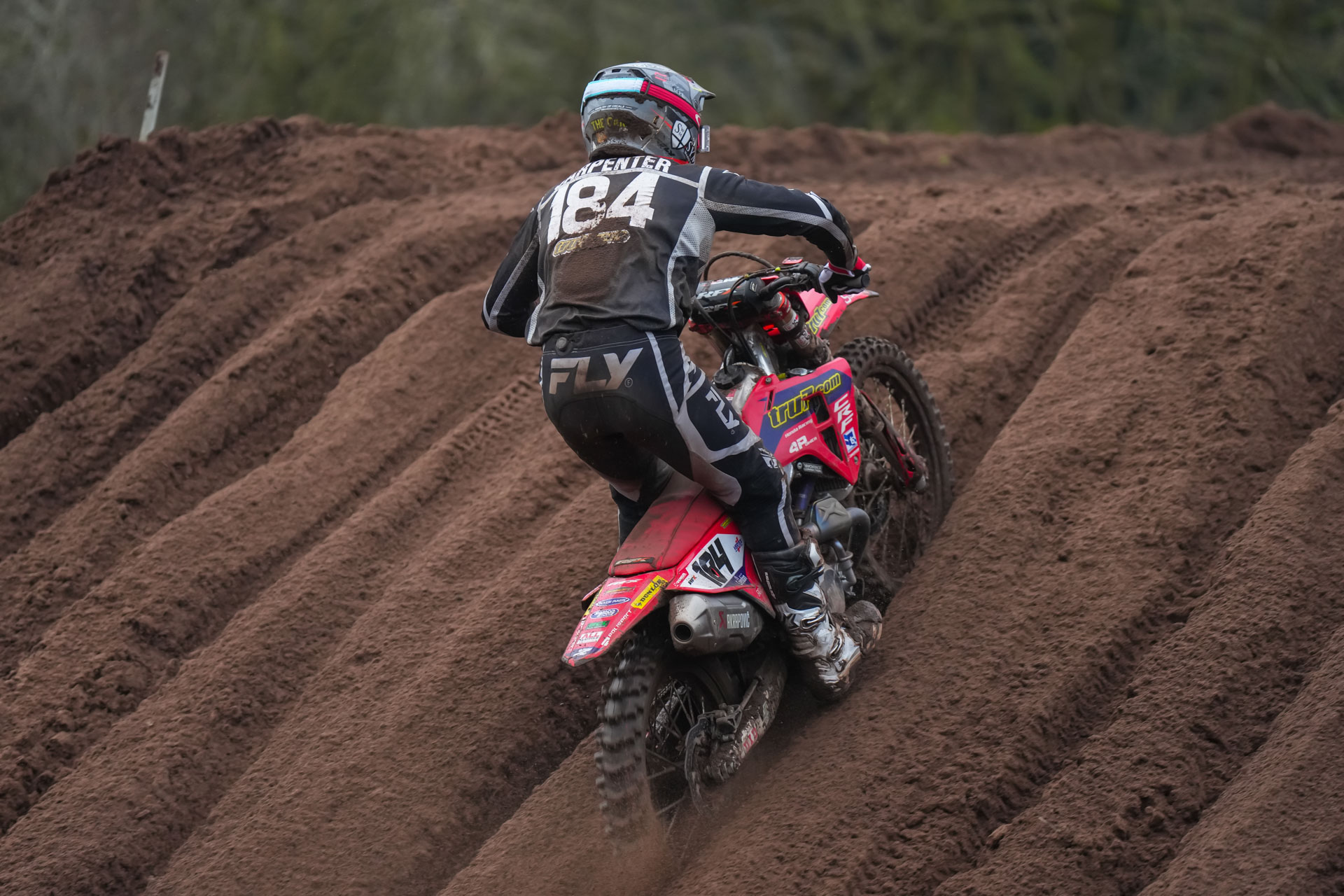 Packed with more than 15,000 spectators to watch some of the world’s top GP riders, the Hawkstone track was rutted, muddy and punishing but Carpenter got better as the day went on. On the 2025 Honda CRF450R he’s been riding in testing to get used to the bike, he found it difficult in the wet conditions in qualifying and was disappointed to take 19th.