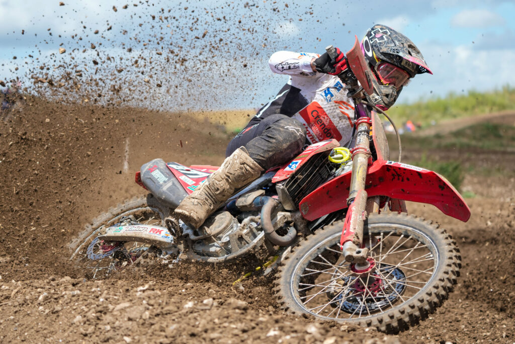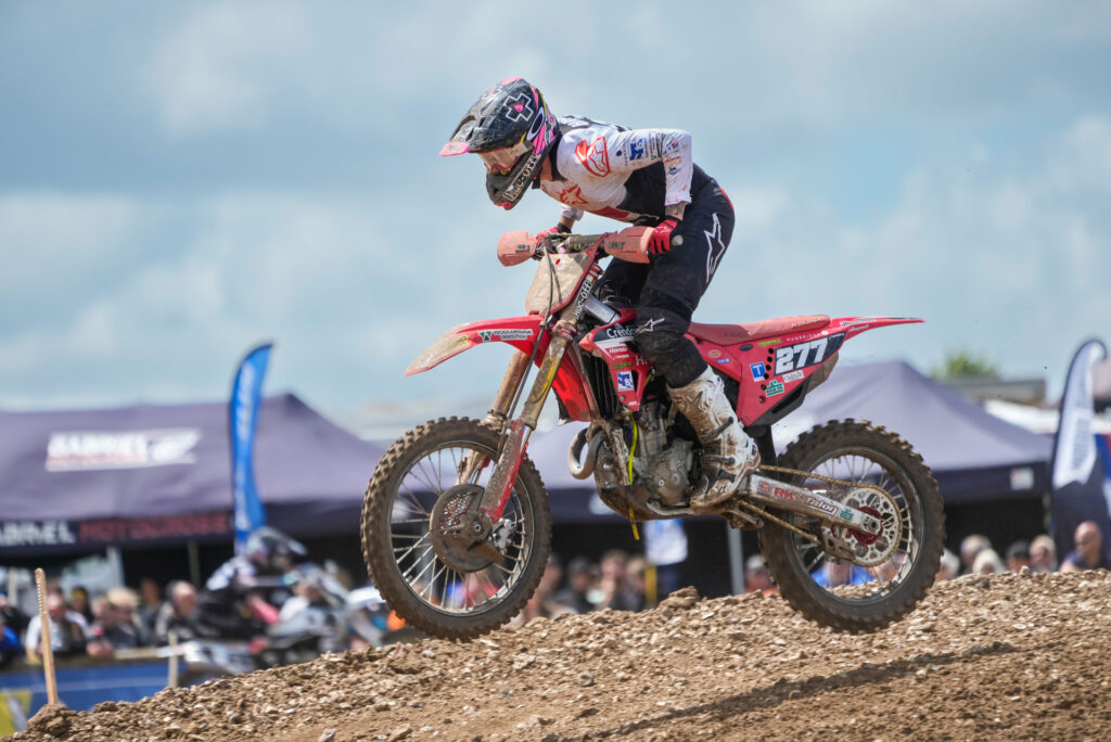 Then in race two, Searle snatched the holeshot and set a calculated pace at the front while Gilbert and Kullas battled for second place. Then on the penultimate lap, a stone jammed the rear brake of Searle’s Honda CRF450R and the current British champ ran wide to avoid crashing. This allowed Gilbert and Kullas through while Searle had to accept third place. This put him on the same points as Gilbert, but Searle was awarded second overall due to the results of the final race.