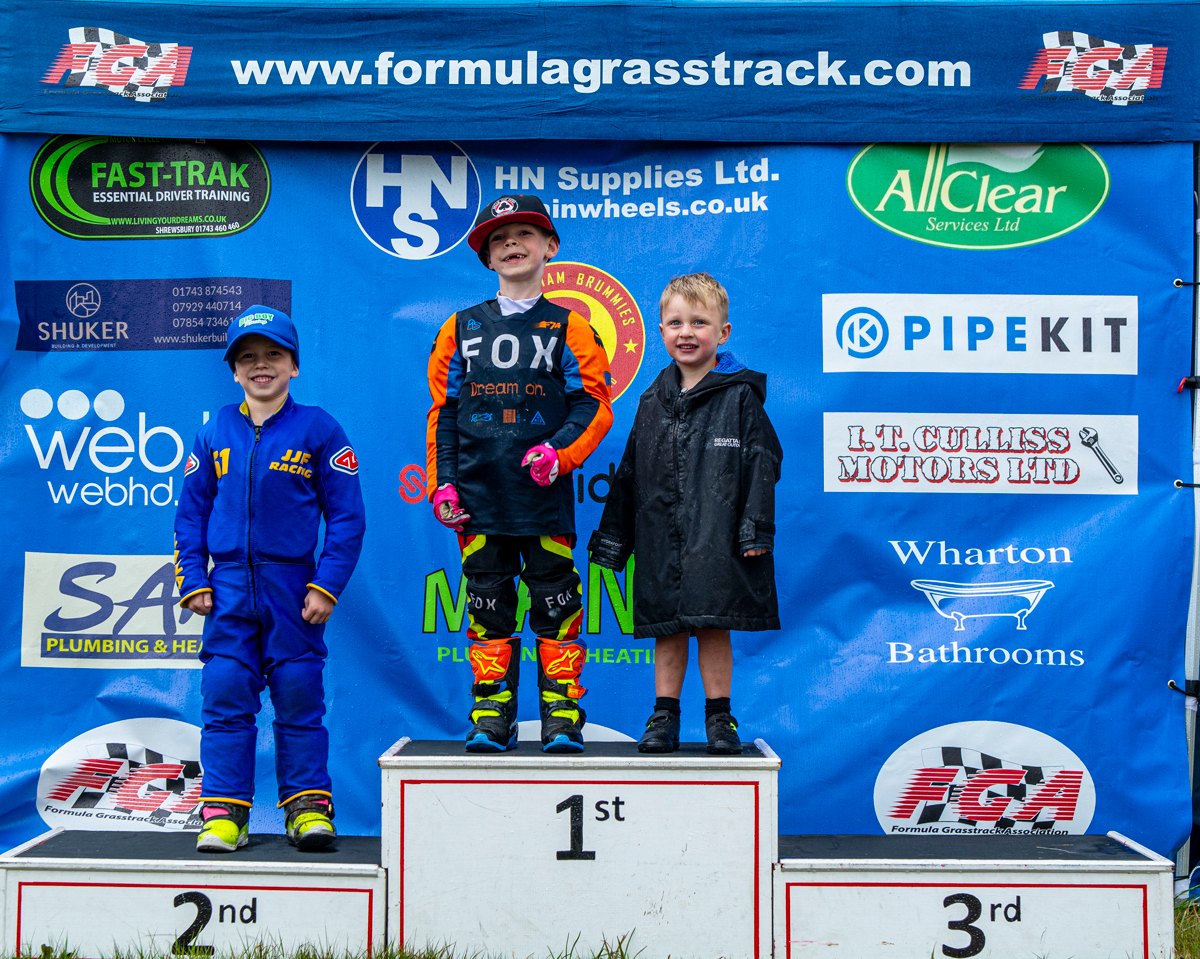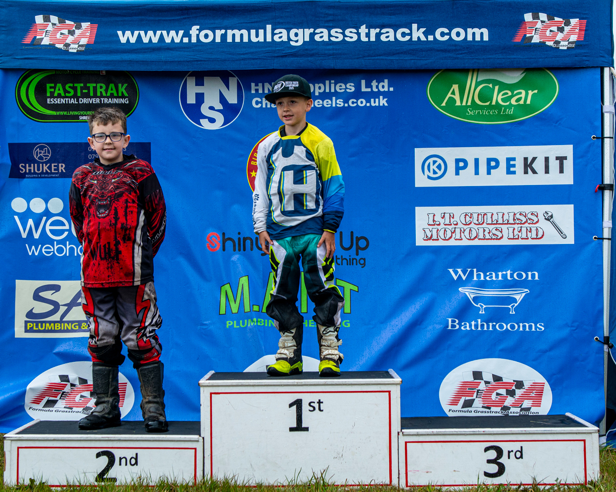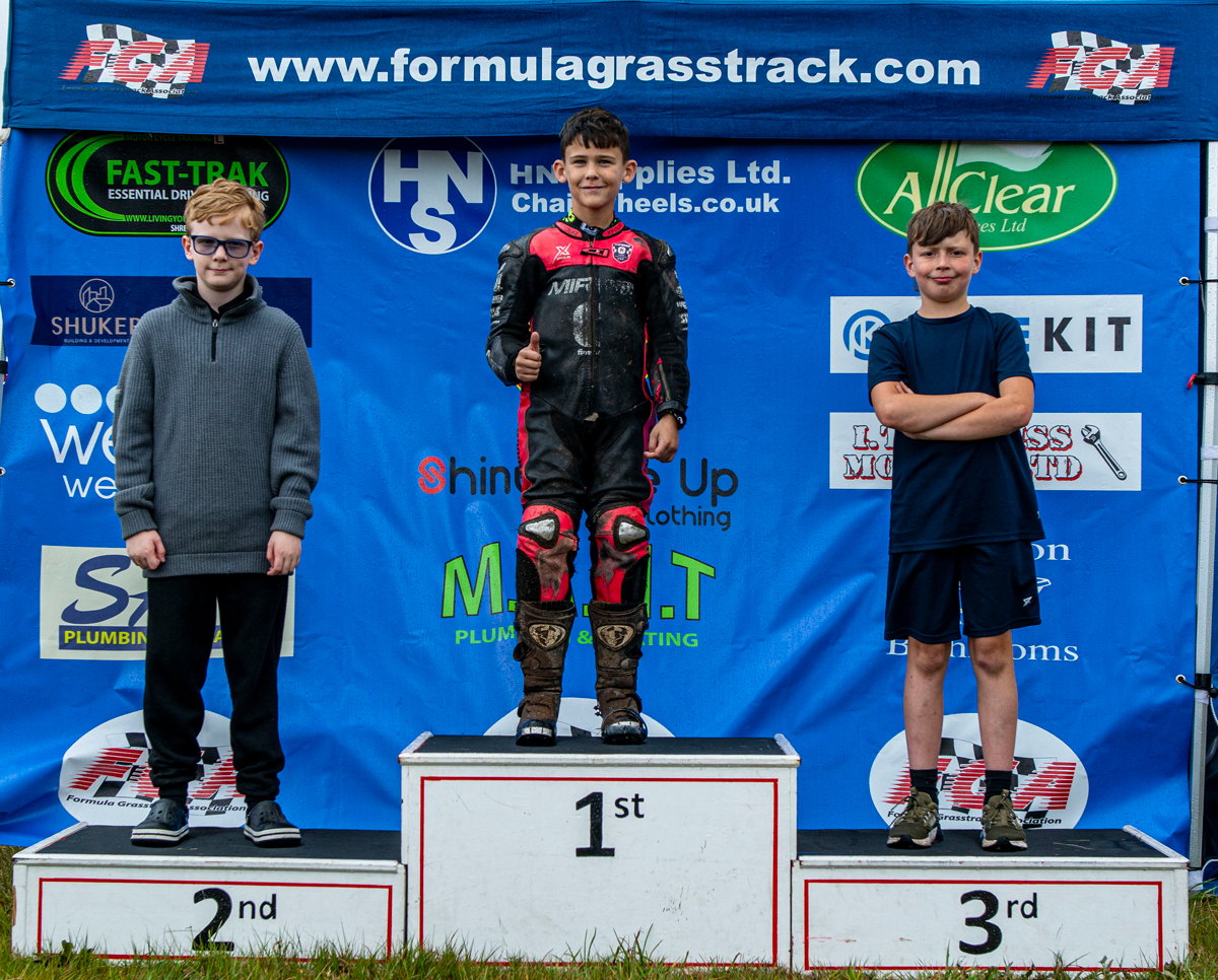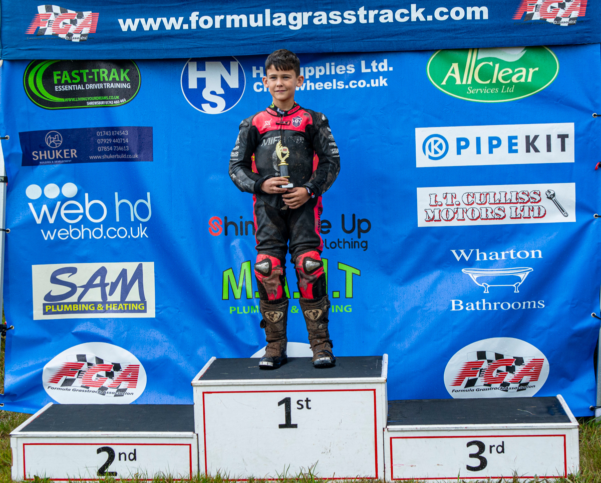 The Senior B final saw Andrew Rowson return to winning ways, who was on different machinery for round seven, with Ben Crabtree riding superbly to take second place ahead of Anthony Rowson who spent the day on brother Andrew’s usual bike following issues with his own. Charlie Glaze secured fourth place, Russell Hall splitting the Glaze brothers, with Oliver taking sixth. Sam Crabtree took an unfortunate tumble, after his best showing yet in the FGA series. Elwyn Beedles failed to start after also falling in his final qualifying heat.