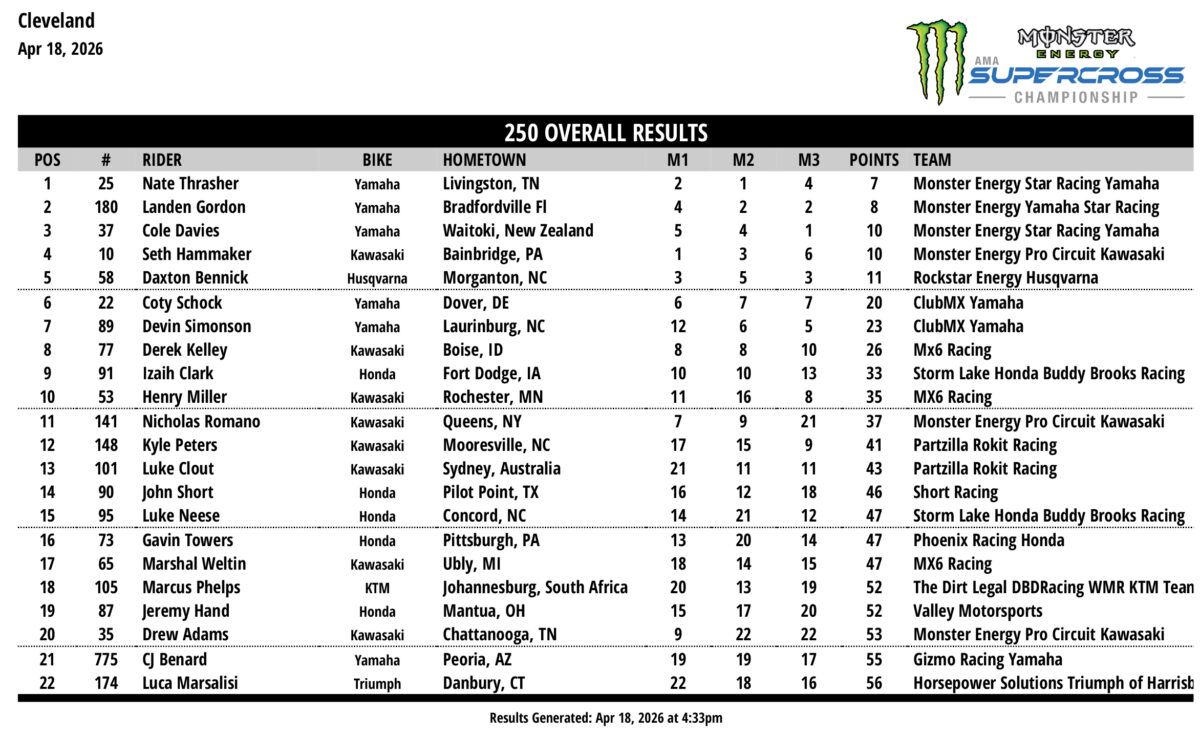Thrasher’s 2-1-4 finishes put him atop the overall standings with a combined score of seven points for the seventh win of his career. He also extended a personal streak of at least one Supercross victory each year of his professional career, which dates back to the 2021 season. Thrasher is the fifth different Monster Energy Yamaha Star Racing rider to win in the 250SMX Class this season for a combined total of 13 victories, which is one shy of the class record for a manufacturer. The runner-up spot went to Gordon, who finished one point behind his teammate for the win following 4-2-2 finishes, while Davies completed a podium sweep for Star Racing in third after the Race 3 victory gave him 10 points with 5-4-1 finishes. Hammaker (1-3-6) finished tied with Davies but settled for fourth by virtue of the Race 3 tiebreaker.