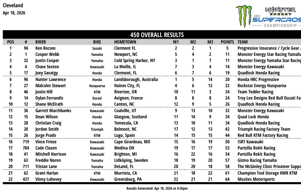 An incredibly consistent effort for Roczen easily brought him the overall win with five points on 2-2-1 finishes, as his 27th career victory has moved him into a tie for 10th on the all-time wins list. Webb (5-4-2) and Cooper (3-1-7) finished in a tie for the runner-up spot, six points behind Roczen with 11 points apiece. Webb earned the edge over Cooper by virtue of the Race 3 tiebreaker.