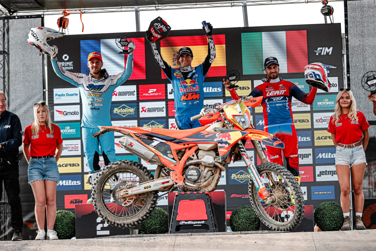 However, a mistake on the second POLISPORT Extreme Test by Cristino saw his lead slip to eight seconds over Australian Angus Riordan (KTM) and Italy’s Luca Colorio (Triumph), who was enjoying his best ride of the season. Extending it back out to 17 seconds on the following GMOTO Enduro Test, Cristino looked to manage that gap as Fantic Factory Racing Team’s Axel Semb and Ox MOTO Beta’s Leo Joyon closed in on Riordan holding second.