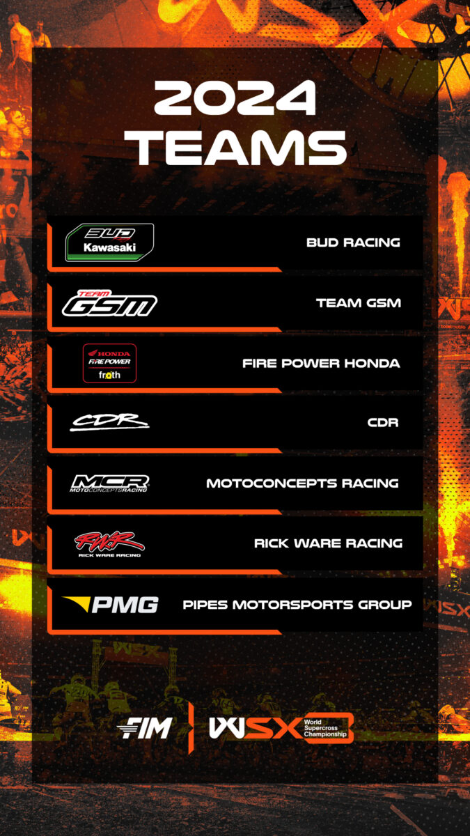 The FIM World Supercross Championship (WSX) can confirm that a total of seven teams will compete in the series’ upcoming 2024 season, fielding competitive lineups across the category’s premier WSX 450cc and SX2 250cc classes.