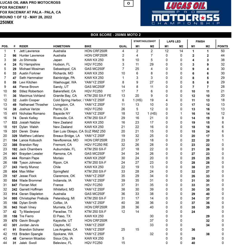 The Lawrence brothers made an assertive opening statement with a 1-2 finish, as Jett took the moto win 6.6 seconds ahead of Hunter. Hampshire successfully fended off heavy pressure from Shimoda for third, while Monster Energy Star Yamaha Racing’s Levi Kitchen rounded out the top five.