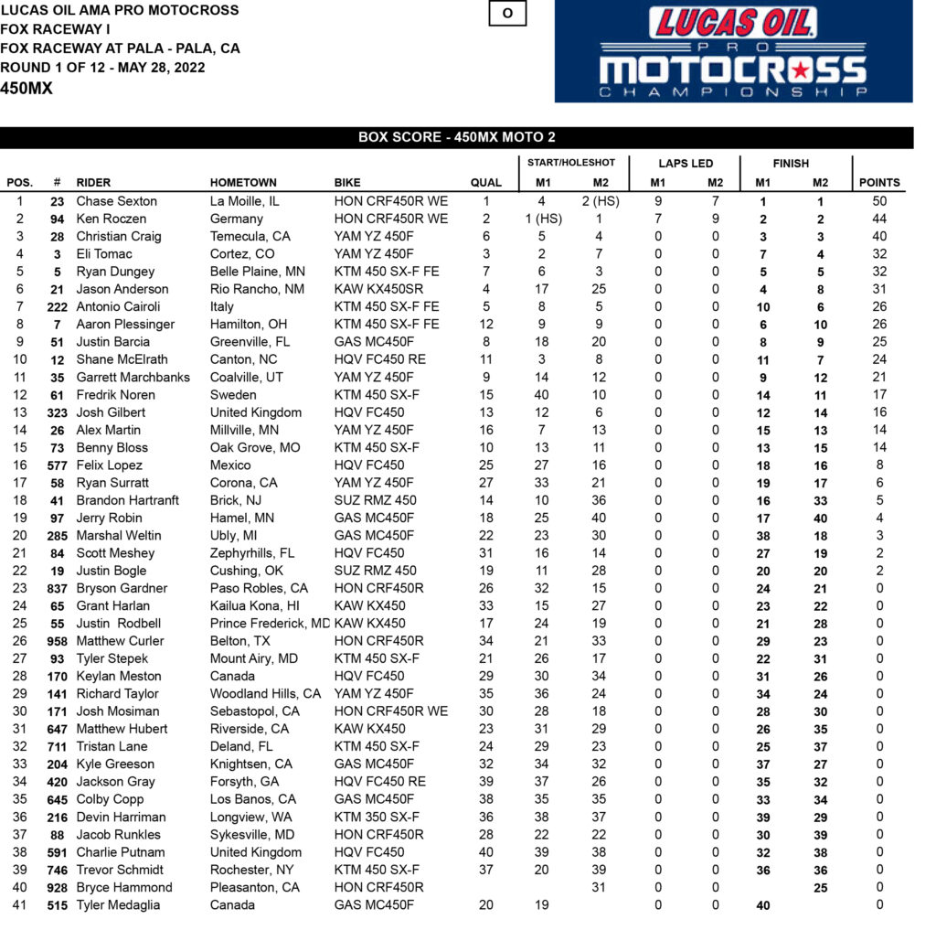 Back out front, Sexton was able to make a pass stick on Roczen and grabbed the lead with just under 10 minutes to go. Roczen didn’t let up and responded to the pass by keeping the pressure on Sexton as they navigated through lapped riders. However, Sexton was simply too consistent over the final stages of the moto and carried on to complete the sweep of the motos by 4.5 seconds over Roczen, while Craig withstood a persistent challenge from Tomac to claim third.