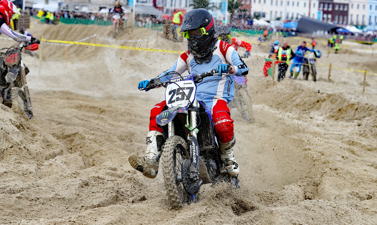 Although the event runs with military-like precision, the one element Purbeck can’t control is the behaviour of the sea tide. And this year it stubbornly refused to retreat as quickly as expected, thus forcing a delay of some 30 minutes before the 330-plus riders could eventually go into action. So, with practice eventually completed, it was time to go racing as legendary Weymouth Beach race starter Jim Shipton, along with Town mayor Caroline Nickinson, lowered the flag to signal the roar of the opening moto of the day.