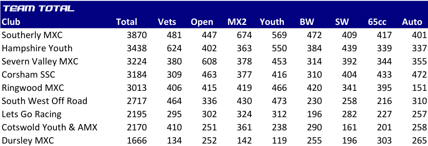 For a third year in a row it was Southerly MXC who took the title once again with an impressive 3870 points, second spot with just 3438 points was Hampshire Youth Motocross Club and taking third place on the podium was Severn Valley MXC with 3224 points.