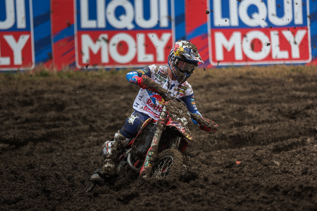 Lucas Coenen had started in a lowly 13th position and had a lot of work to do on the slippery and sloppy circuit, while WZ Racing Team’s Oriol Oliver ran as high as fourth in the opening laps. Reisulis was ahead of Laengenfelder, but Liam Everts suffered a small tip over in the first lap, which would ultimately prove to be costly for the Red Bull KTM Factory Racing rider!