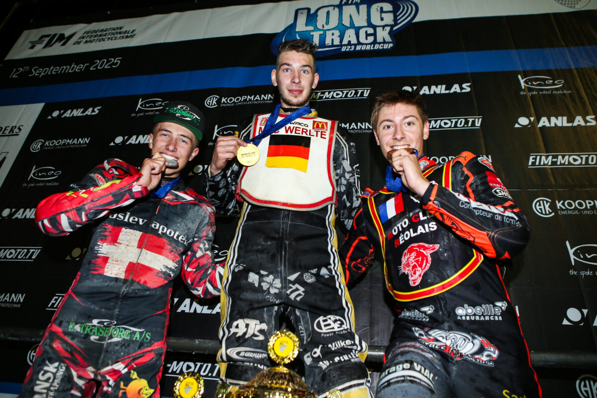 Starting from gate four, Wachs reacted quickly when the tapes went up on the Grand Final and was able to sweep around the outside of Kruse and Ugoni in the first bend and was never headed again as he raced to the FIM Long Track Under 23 World Cup. Kruse pushed him hard for the full duration in second with Ugoni competing the podium ahead of Bouin and Urda.