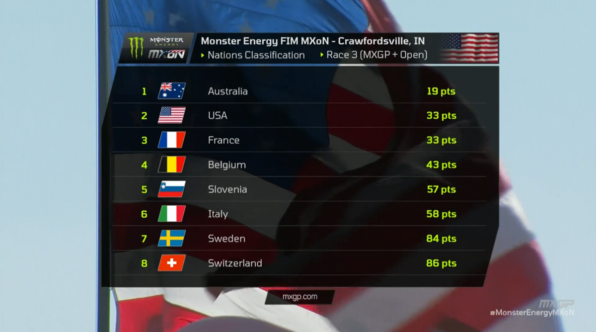 Team USA won a pitched battle with Team France for the runner-up position, with decisive moves going back and forth in the very final laps of the day! Ultimately they finished on equal points, the best result tie-breaker going to the host nation with a second place for Eli Tomac in Race 3.