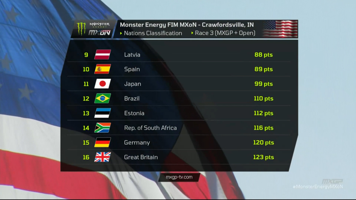 Febvre had done his bit, and Hampshire was out after another crash, so with Tomac unable to catch Hunter for the lead, the French looked to be on for second place, until Gifting found his way past Renaux in the middle of the circuit to take eighth in the race and knock France back to third overall!