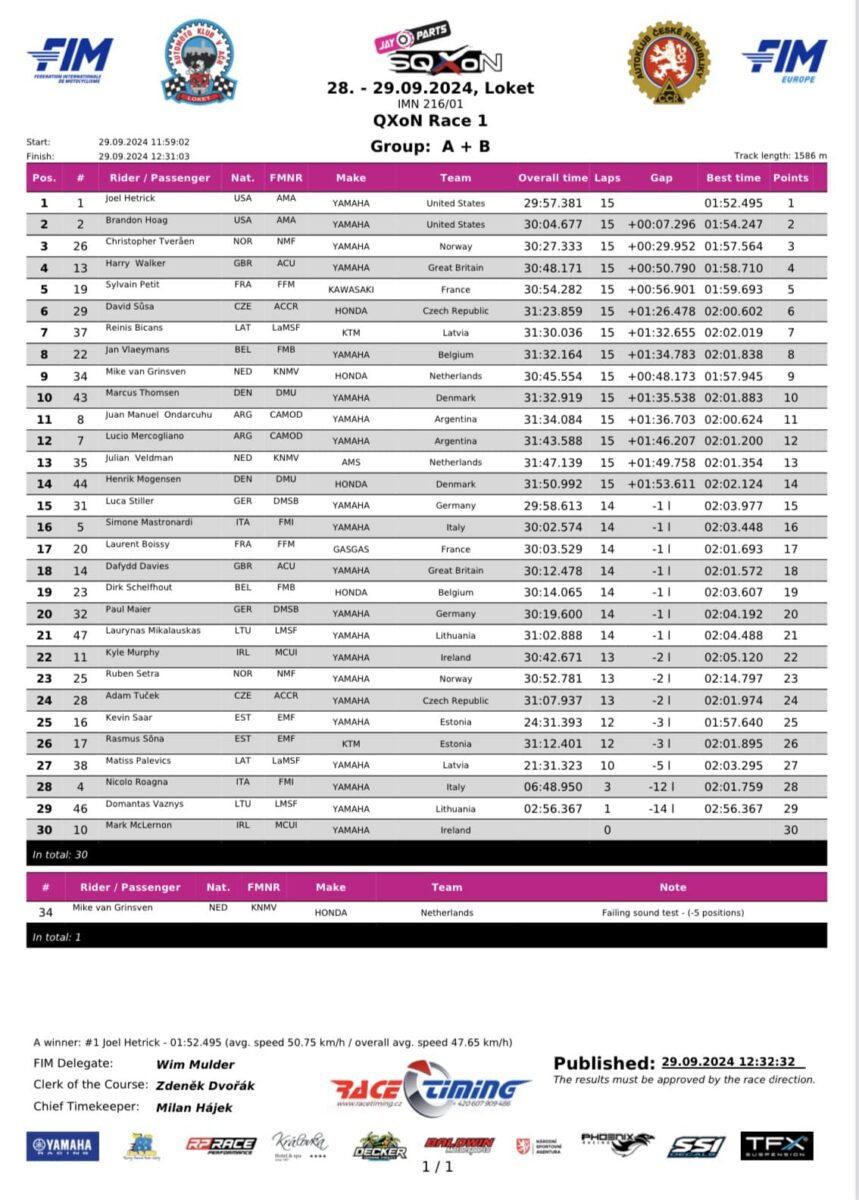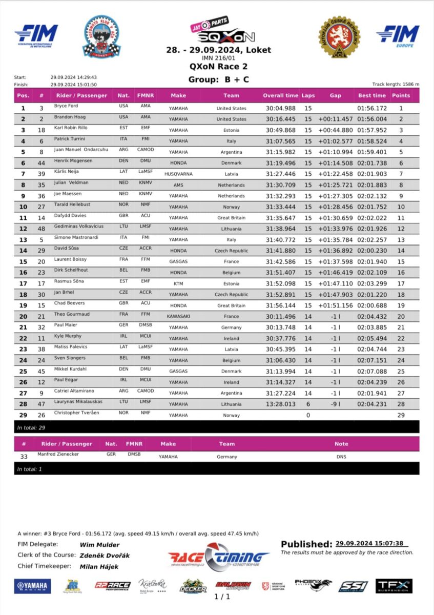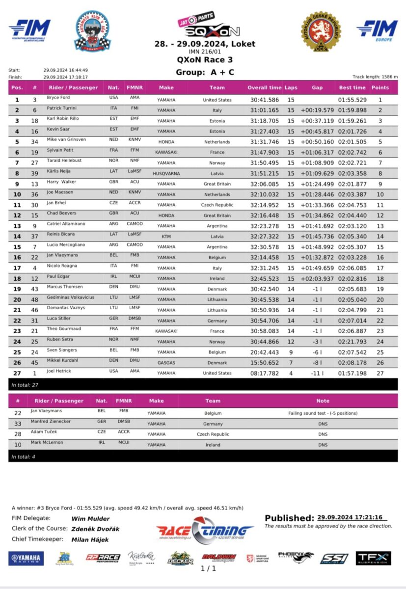 As half-race distance rapidly approached, Bryce Ford found his way through on both Estonian competitors, and set about reducing the deficit that Turrini had opened with the track in-front cleared by the retiring Joel Hetrick. An air of inevitability surrounded the fight for the race lead and, despite putting up his best defence, it would not stop the lone Team USA rider of Bryce Ford to take the race lead, of which he would not let go of by the chequered flag. A fantastic showing from Team Estonia would see them take the chequered flag in P3 and P4, with Rillo leading the way ahead of Saar and, as was the case earlier this afternoon, Sylvain Petit did not have an easy time as he simultaneously had to defend from Tarald Hellebust, as well as chasing hard after Mike van Grinsven.