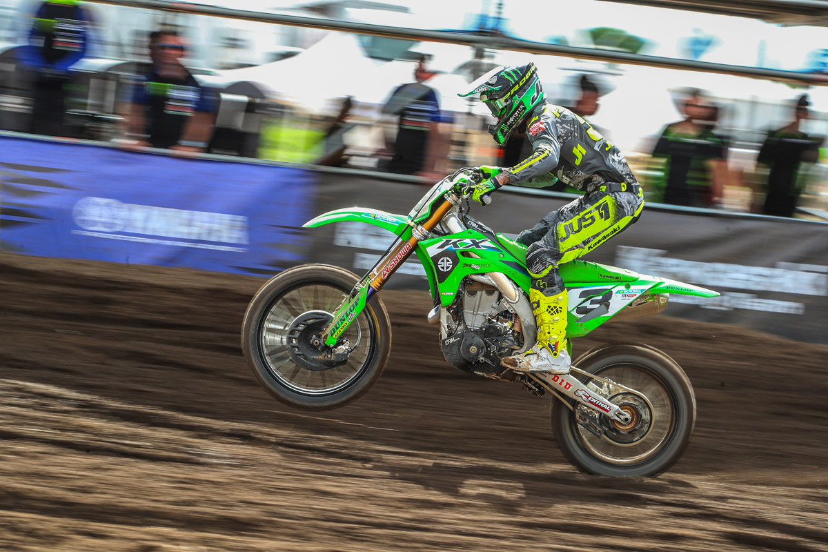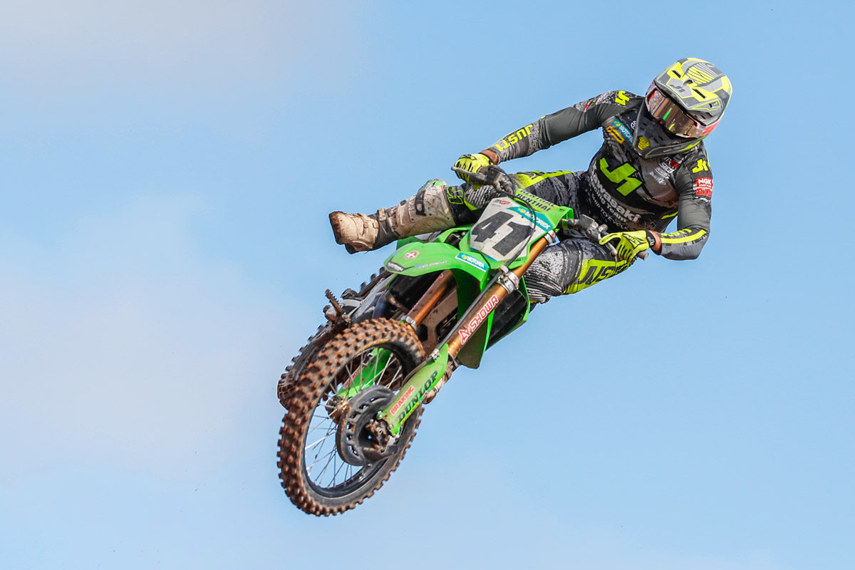 KRT teammate Pauls Jonass had an unspectacular opening moto; tenth on the first lap, he maintained that position throughout the moto in a leaderboard freight train. A better start in race two saw the Latvian hold seventh place through the early laps before surrendering a couple of places in intensive leaderboard battles, but his eventual ninth was enough to ensure seventh overall on his Kawasaki debut.