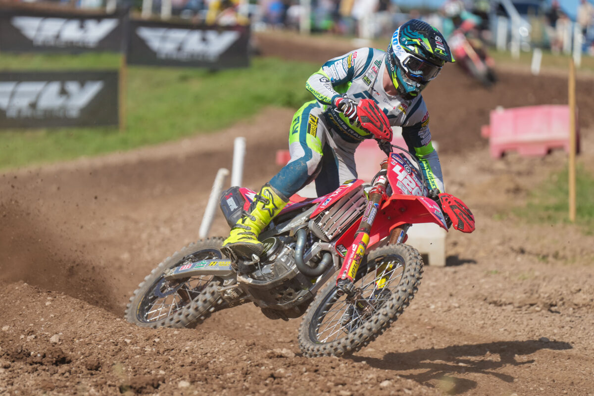 The Crendon Tru7 Honda set the fastest time in qualifying at the old-school Landrake circuit then wasted no time in getting to the front of the opening moto. Gating in third place, he quickly got past John Adamson and set his sights on race leader and fellow Honda CRF450R rider Josh Gilbert. Local ace Gilbert held Mewse off until the third lap when the lead changed and Mewse pulled away to win by 10 seconds.