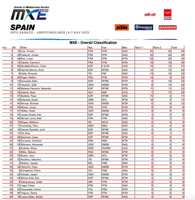 MXe Championship – Top 10 Classification: 1. Timoteï Cez (FRA, GAS), 50 points; 2. Jordan Cadenel (FRA, GAS), 44 p.; 3. Lucas Bos (FRA, KTM), 40 p.; 4. Camronn Gautier (FRA, KTM), 34 p.; 5. Víctor Moratilla Moreno (ESP, HUS), 31 p.; 6. Enzo Garrido Barrios (ESP, GAS), 24 p.; 7. Riccardo Galia (ITA, GAS), 23 p.; 8. Mathis Negre (FRA, KTM), 23 p.; 9. Adan Quesada (ESP, KTM), 22 p.; 10. Eddi Haustein (GER, KTM), 22 p.;
