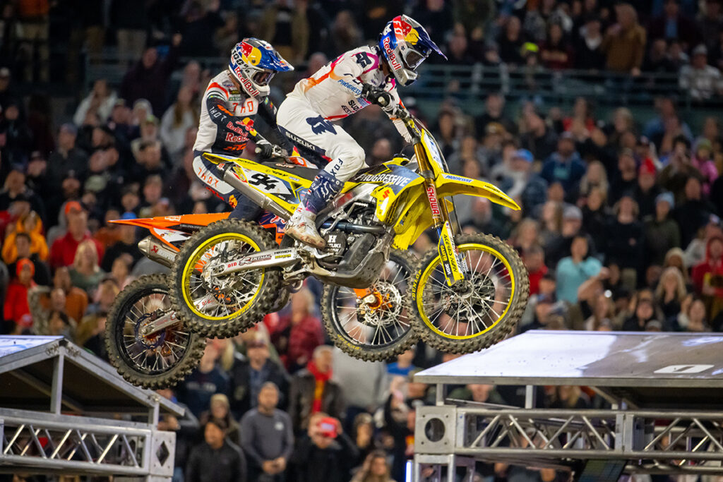 Then Tomac crashed on the bridge jump he’d used to take the lead. Malcolm Stewart found himself out front. The crowd erupted as the Husqvarna rider saw his best shot at his first 450SX Class victory. At the halfway point Stewart led, Sexton pursued in second place, and Roczen sat third. Sexton challenged for the lead as Tomac started his charge back to the front.