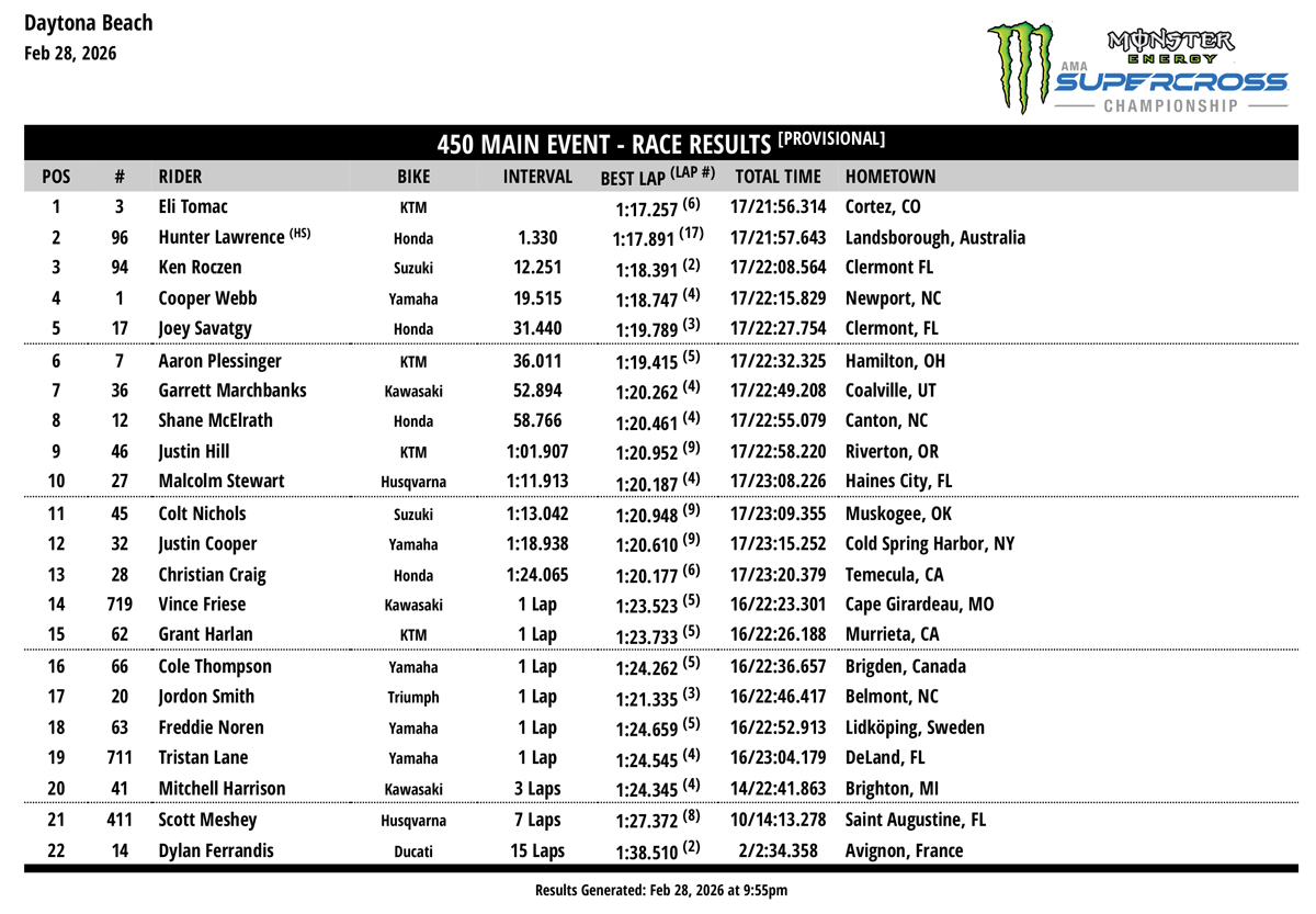 It was a historic night inside The World Center of Racing for Round 8 of the 2026 Monster Energy SMX World Championship, as Red Bull KTM Factory Racing’s Eli Tomac cemented his place atop the all-time greatest racers at Daytona International Speedway with a record breaking eighth Monster Energy AMA Supercross Championship win at the iconic venue. The Colorado native broke a three-year tie with NASCAR legend Richard Petty, owner of seven Daytona 500 victories, to become the most decorated athlete of the speedway’s celebrated 67-year history.