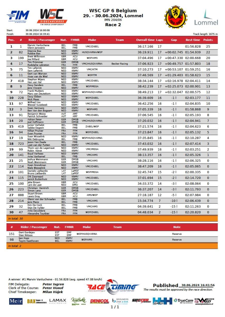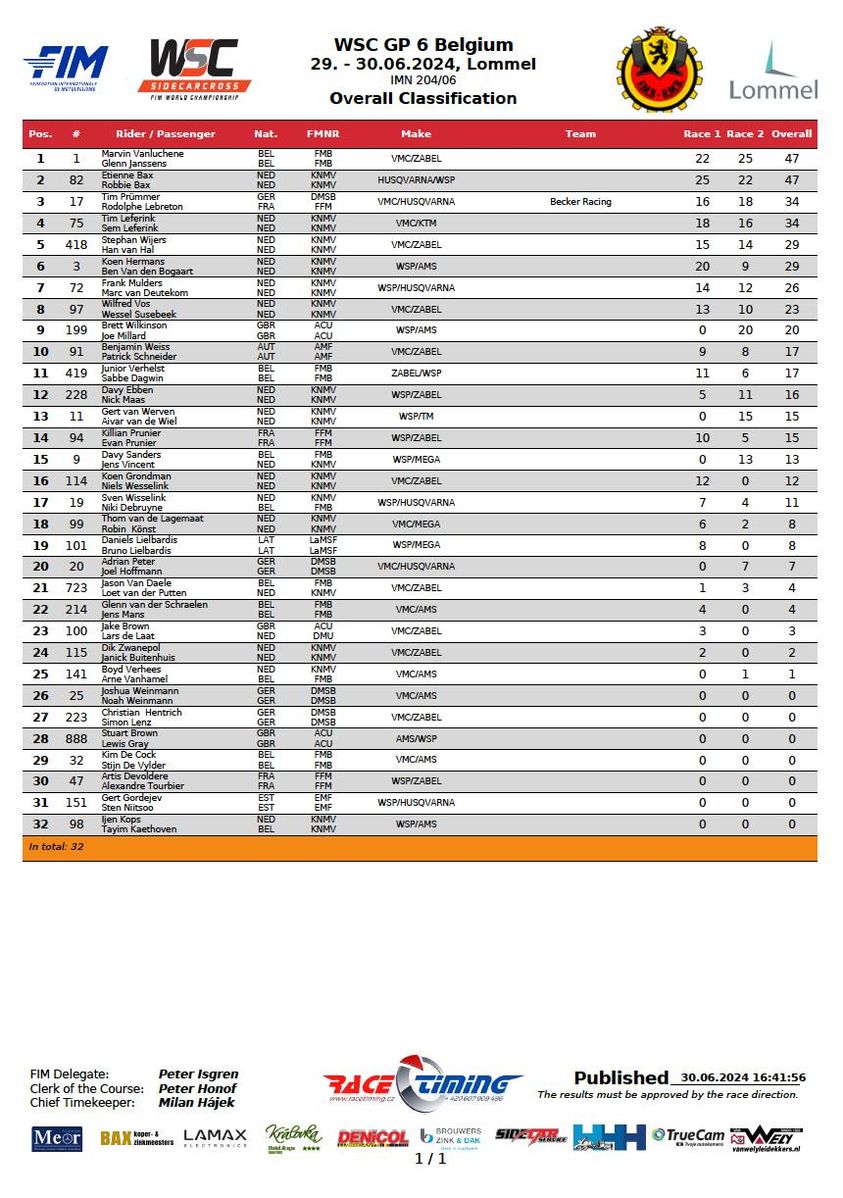 Tim and Sem Leferink’s performance from twenty-fifth place start, was equally impressive as they fought to fourth, passing wherever they could. Their speed was good, but they will have to do it all again, as indeed will Vanluchene.