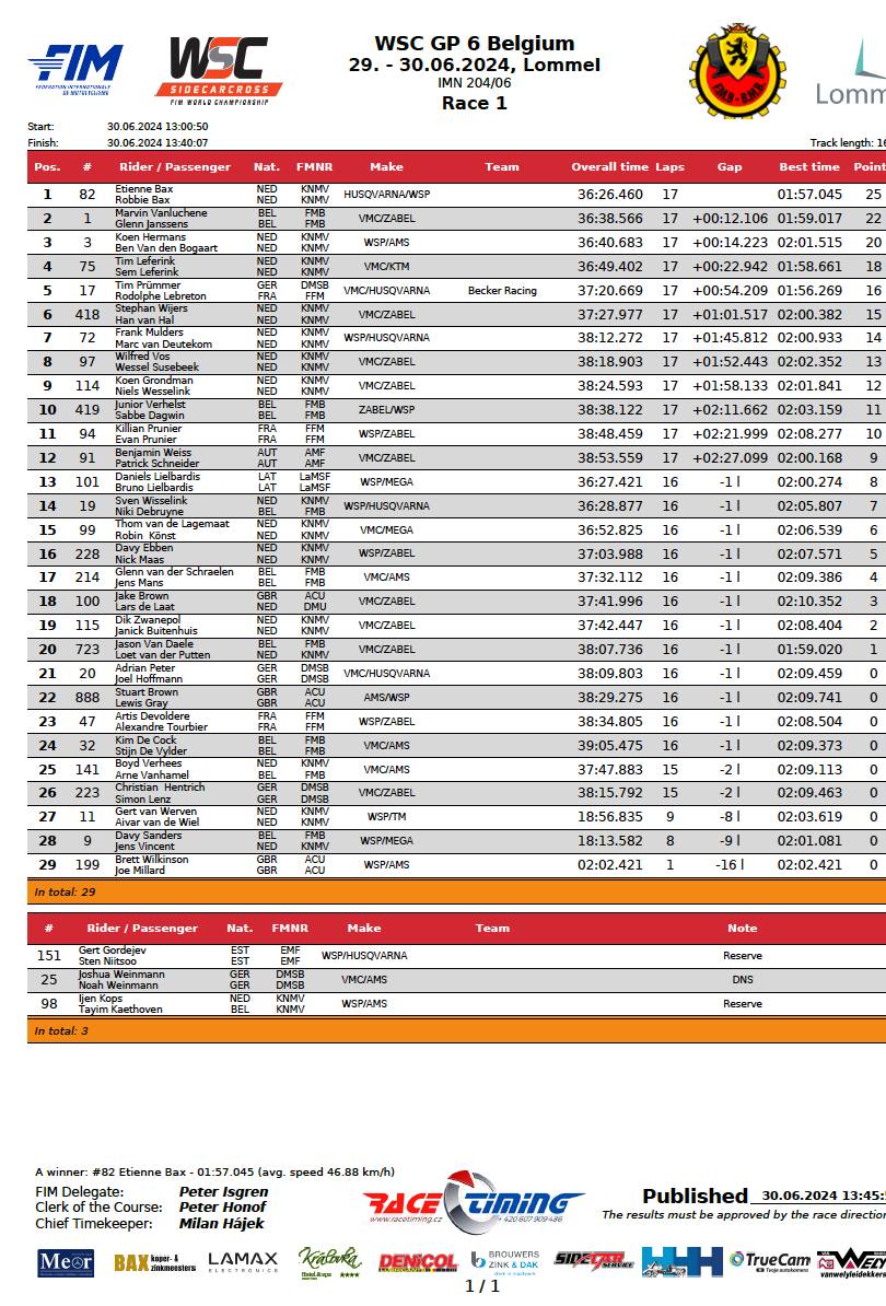 Once on the back of the red plate holders, the defending champions had all the inspiration they needed and fired past the Latvians at speed. The gap to Bax was around twelve seconds, but Vanluchene tried with all his might to close it down. Then dramatically, on the penultimate lap, the Lielbardis boys dropped out of sight, having suffered a mechanical problem at the back of the circuit. They recovered to keep going and be credited with thirteenth place.
