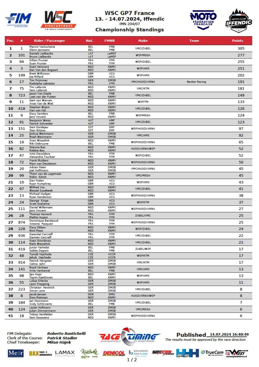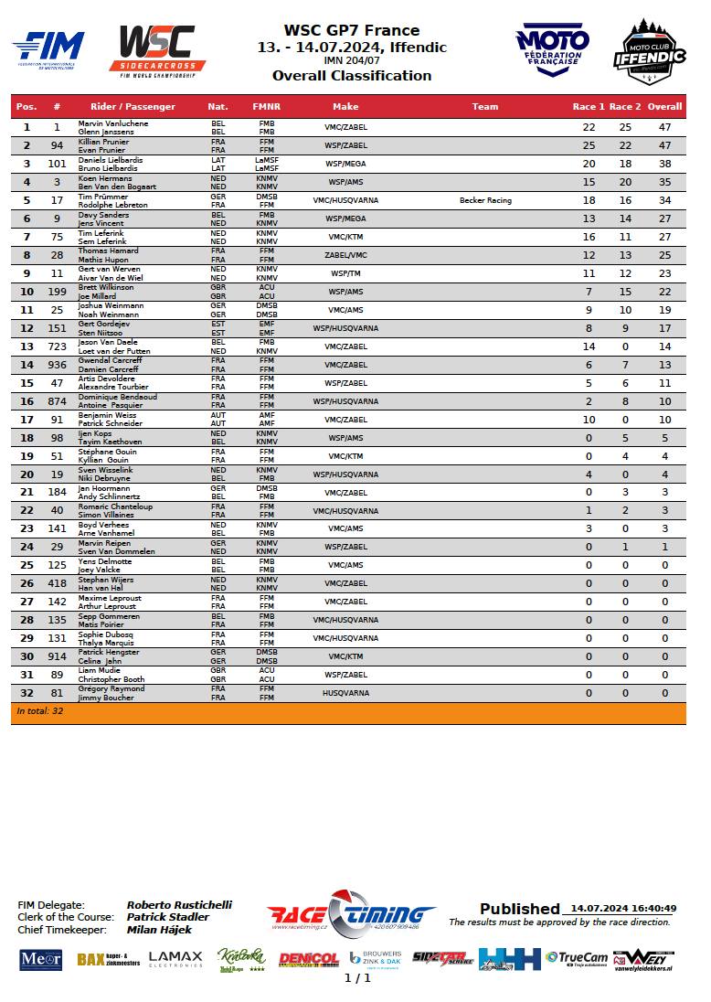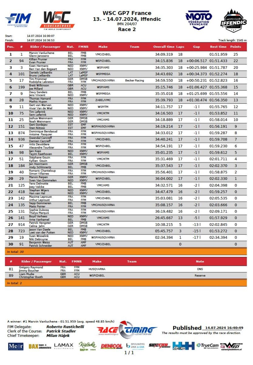 Hermans progress past Lielbardis happened so quickly it was hard to determine if it was a mistake on their part or sheer skill by Hermans. He made it through to a fine third place. Then around half distance, van Daele crashed out, putting the outfit through the fence. This was not before Vanluchene had overtaken him. At the front with more than half the race gone, Prunier was now up to second and closing on the red plate. By that time, they were into the tail enders, and Marvin used these to his advantage, stretching the gap to four seconds at the flag.